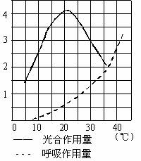 读某种作物在一定光照和不同温度条件下光合作用量(总光合作用量减去呼吸量)和呼吸作用量的变化曲线图,完成4-6题:![]()