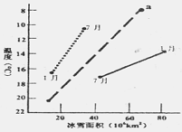 下图中的三条线表示全球及南、北半球月平均气温变化与冰雪覆盖面积的对应值,读图回答45-46题。