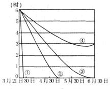 上右图四条曲线分别示意四地3月21日到6月30日的日出时间。读图,回答12--14题。