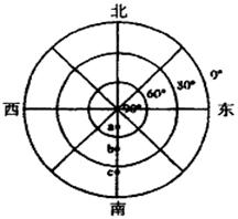 上右图中a、b、c三点表示P地二分二至日某时分的太阳方位和太阳高度(P地位置在圆心处,同心圆上的数值表示太阳高度),据图回答4--5题。