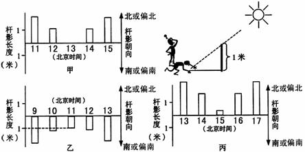 甲、乙、丙三地同学共同开展了一个关于日影长度测量的探究学习活动,他们在6月22日中午时分每隔一小时测量一根长1米的竹杆的影子长度,并将所得数据绘制成图,如图所示,读图完成6--7题。