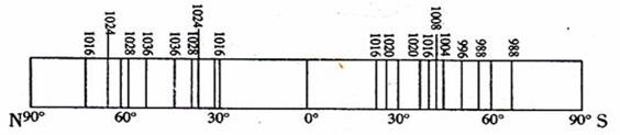读90°E附近海平面气压图(单位:hPa),回答10-11题。