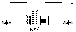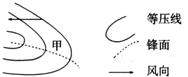 (4)下图为图1所示锋面经过杭州的过程,移动方向为从甲到丙。当锋面位于甲处时,乙处的气温较甲处 ,当锋面位于乙处时,市区往往出现 天气,在锋面从乙处移到丙处的过程中,市区气温的变化是 ,气压的变化是 。