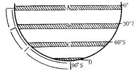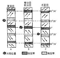 ⑶在图中相应的位置上添画箭头表示各风带风向,并标注风带名称。