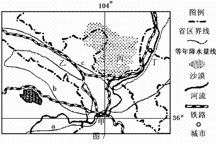 ⑶乙和丁所在地区是我国西部重要农业区,其农业生产共同的主导因素及农业发展中应注意的问题是什么?(8分)