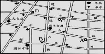 下图是北方某城市书店和书亭分布图,读图回答14-15题。
