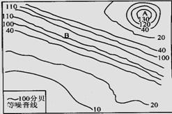 最近,英国科学家研制出了一种噪音地图。假如下图为某城市噪音地图的局部,图中曲线为等噪音量线(单位:分贝)。据此回答21-22题。