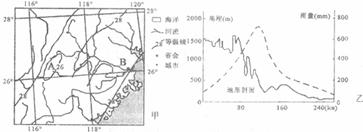 (2)归纳左图中B地形区降水的分布特点,简述造成该地降水差异产生的主要原因。