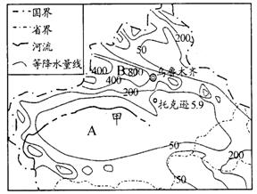(3)根据等值线分析A、B两地降水量的差别及主要原因。(3分)