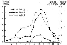 下图为“我国某河流中游水文观测站多年月平均降水量、径流量、输沙量变化图”。读图回答19-21题。
