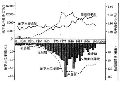 (2)20世纪80年代后期地面沉降量进入减缓期,由图可知其主要原因是 ,但天津市发展依然面临着水资源短缺的问题,试分析水资源短缺产生的原因并提出可行的解决措施。(5分)