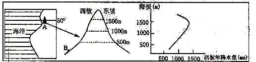 读“A山及其西坡年降水量分布示意图”,回答31--32题。