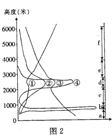 图 2 是某山地海拔高度与植物生长量、年平均气温、年降水量、年太阳辐射量的关系图。图中横坐标表示植物生长量、年降水量和年太阳辐射量及年平均气温 , 从左至右是由小到大。回答 3-5 题。