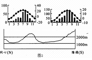 读我国西部两县城之间地形剖面图和降水量气温示意图,回答4一5题。