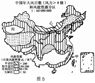 材料一:我国风能资源分布图(图A)