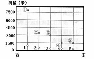 下图是30°N附近五座名山的海拔比较图,图中①②③④分别代表贡嘎山、二郎山、峨眉山、庐山和黄山,空心圆圈表示各山的山麓位置,读图回答19-22题。