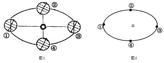 (2)图1与图2中的①②③④四点在地球公转轨道上的位置一致。请在图2中画出10月8日地球在公转轨道上位置示意图(绘出地球和地轴)。