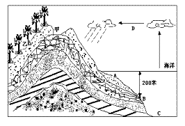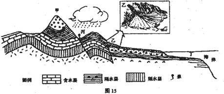 28.(浙江省余杭高级中学2010届高三上学期第二次月考)读某地区地质构造剖面示意图和部分水循环示意图,回答下列问题。