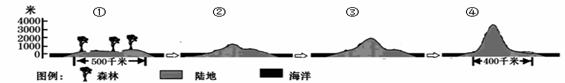 (福建省“四地六校”2010届高三上学期第二次联考)①②③④四图是某大陆从地质历史时期至今的、沿45°纬度的地形剖面示意图,(图中箭头指地形演变趋向)。读图回答1-3题。