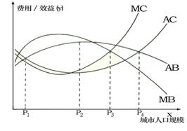 13.(广东省2010届高三六校第二次联考)如图:AB表示随城市规模的扩大而增加的平均每人的效益;MB表示城市每增加一个单位成员应有的城市效益。AC表示城市平均生活费用随城市规模的扩大而变化的曲线;MC表示城市每增加一个单位成员而产生的城市费用。对于城市个体成员而言净效益最好的城市规模和对于城市总的纯效益而言(决策者所追求的目标规模)效益最好的城市规模分别是( )