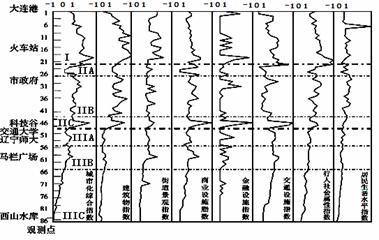 15.(山东省临沂一中2010届高三11月综合训练)沿城市某一道路为剖面线纵向“切开”城市,以建筑物的高度、街道景观、城市配套设施、居民社会人文以及行人社会属性等指标的沿线变化状况作为横截面,称为城市剖面。它反映城市发展水平在不同地域的级差变化,是从微观定量研究城市发展的一种方法。