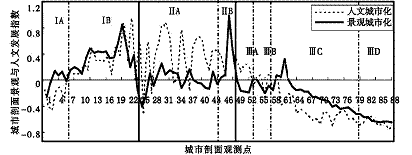材料三:下图为大连城市剖面景观与人文发展指数分布图。城市化过程上看一般分为景观城市化(即可以被人们所观测到的城市的发展变化,如道路的繁荣、高楼的林立)与人文城市