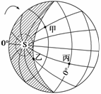乙、S三地的纬度差异以及地球自转速度的分布规律判断。第(2)题,地球上任一点所在纬线的昼弧长度决定了其昼的长短。由乙、丙两地昼弧跨越的经度数可以计算出其昼的长短,进而可计算出日出时间,从而得出该题结论。第(3)题,由光照图可知,南极圈内全部为极夜,为北半球夏至日,太阳直射在北回归线上;丙地在赤道上,从而可得出丙地的正午太阳高度;要使吸热面板获取的能量最多,需使太阳光线与吸热面板垂直,从而计算出α的大小。第(4)题,夏至日,南京日出东北,日落西北,正午时日影最短,从而可知日影轨迹。