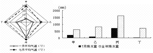 读图,甲、乙、丙、丁四个地区的气温雷达图和降水柱状图,回答32-33题。