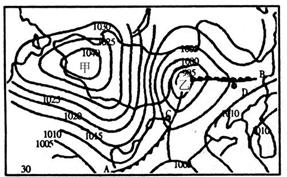 答案:29.D(解析:暴雨一般出现在夏季。)30.D(解析:西北部等压线密集,气压梯度力大。)