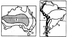 (2)澳大利亚东岸B、C、D三地气候与南美洲西岸a、c、d三地气候的排列都是南北更替、南北延伸,形成这种状况的相同因素主要有 ,不同因素主要有 。