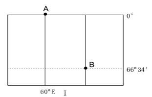 例 2.下图中相邻两条经线的经度差为 30 度,A、B 为晨昏线上的两点,大阳直射在西半