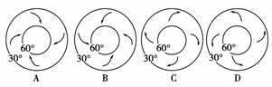 下图是以极点为中心的半球示意图,箭头表示地球自转方向。读图回答1-2题。