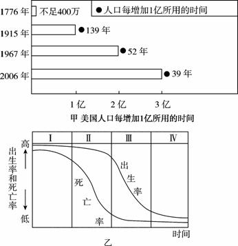 1.美国的人口增长处在图乙中的第___________阶段,遇到的问题是 ( )