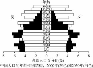 4.读中国2000年到2050年人口年龄性别构成图,2000年与2050年中国人口的年龄性别结构的共同特点是 ( )