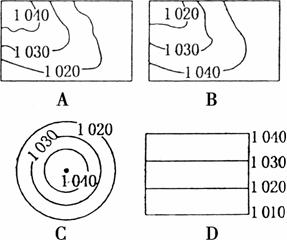 10.图中天气系统一般出现在下列哪种气压状况图中(单位:hPa) ( )