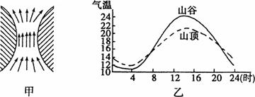 16.(2010年武汉调研)我国是一个多山的国家,山地对气温、降水和风的影响十分显著。下图中的甲图表示的是空气由开阔地进入山地峡谷时产生的大风现象。乙图是黑龙江省某地不同地形的气温日变化示意图。读图回答问题。