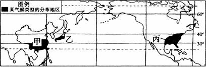 (4)图中甲、丙两个气候区的纬度分布有什么差异?为什么会形成这种差异?