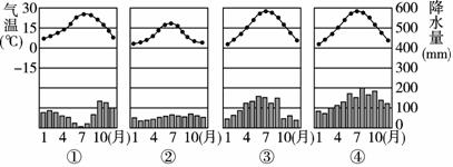 (3)下图中的四幅气候资料图中,与乙地的气候特征相符的是___________。这表明乙地的气候特征与甲、丙相比有细微的差别,体现在_____________。
