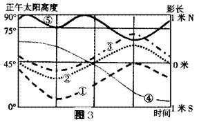 4.图中①、②、③、④四条曲线中,能正确反映该地正午时物体影长周年变化是 ( )