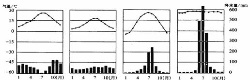 53、请将气候类型的代号填在与之对应的降水柱状图和气温曲线图括号内:(4分)