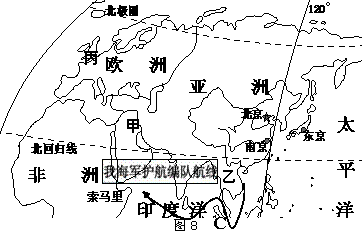 (2) 中国海军护航编队从三亚出发到达索马里海域,途径C处为 海峡,此处属于 气候。
