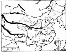 ⑵山脉B是 ,它位于我国第 级阶梯的分界线上,属于 走向的山脉。