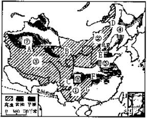 1)在图上标出我国地势三级阶梯分界线上的山脉A____、B____、C____、D____、E____、F____、G____。