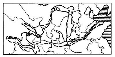 (1)图中数码代表的山脉名称是:① ;③ 。