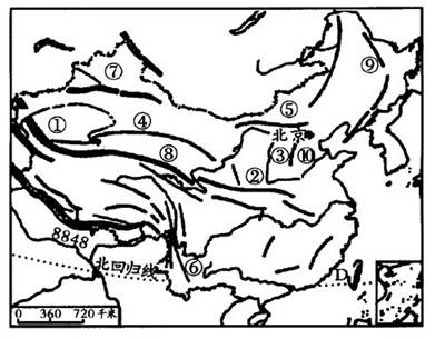 (1)图中数码代表的山脉名称是:① ;③ 。