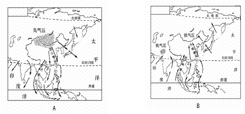 读我国冬季风、夏季风示意图,回答下列问题:(8分)