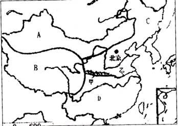 (2)C、D两区域之间的界线由甲____________ (山脉),乙____________ (河流)构成,该线是1月____________等温线,____________mm等降水量线通过的地方。