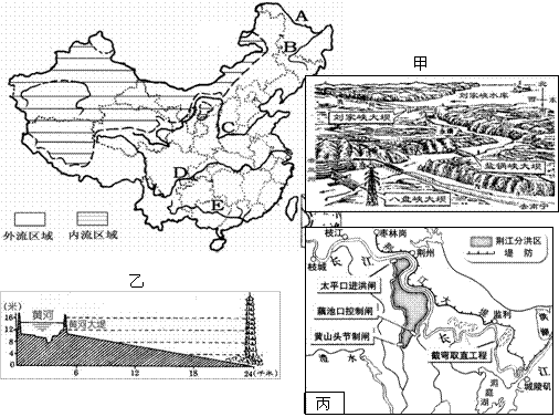 ⑵甲、乙、丙三幅示意图中,表示黄河上游梯级开发的是 图。表示“地上河”的是_ 图,“地上河”是黄河 游的特征。“地上河”的主要危害是 。