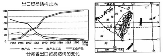 (4) 根据“台湾省了口贸易结构的变化”图,分析台湾出口商品变化的基本情况是: ,目前台湾已形成了“ ”型经济。