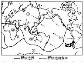 (3)北京时间2010年2月27日14:34,智利发生里氏8.8级特大地震,由右图我们可知道此次地震主要因为 板块和 板块碰撞挤压造成的。